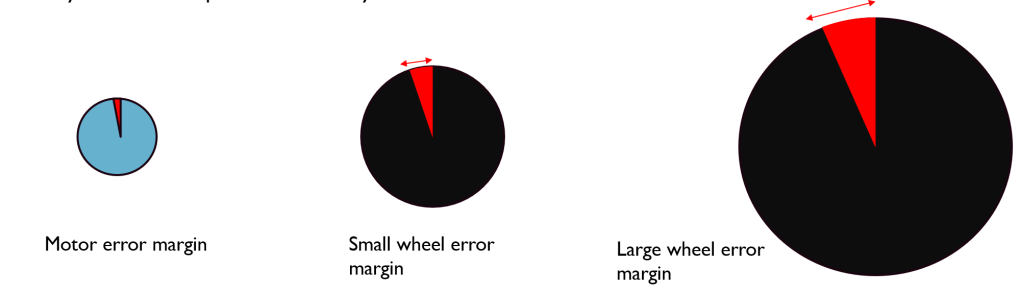 As you can see, motors can jiggle around slightly. Next time you’ve got your robot, try wiggling around the wheels. You may notice that they are not completely rigid: they can wiggle around slightly. This impact gets greatly amplified by using large wheels, as drawn on the diagram. Therefore, you will probably get greater accuracy by using small wheels.