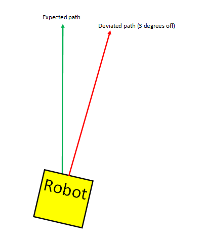 For example, let’s say you want to move forwards by 10cm. However, there is a bit of dust on the mat a few cm in. So unfortunately, the robot veers right by 3 degrees: