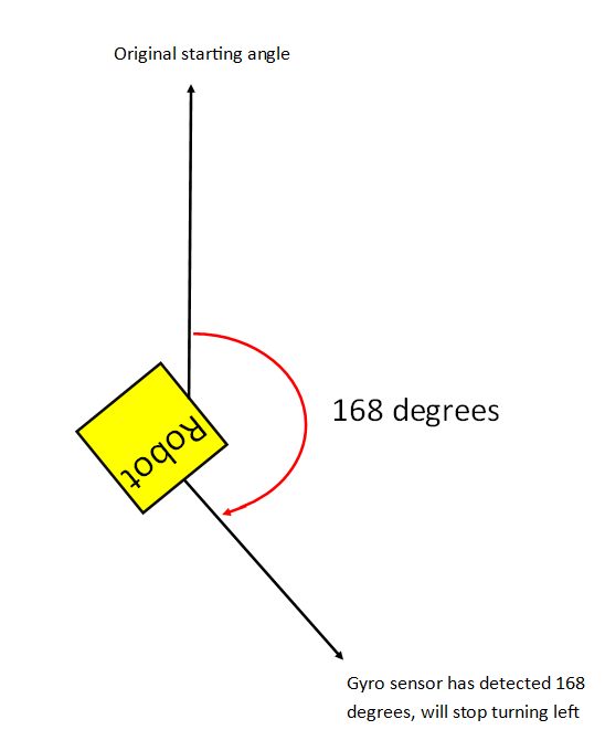 However, this is not a accurate way of turning. You can make your turns more accurate with the gyro sensor. The way it works is that the robot will start turning in the direction and will constantly check if the angle has been reached.