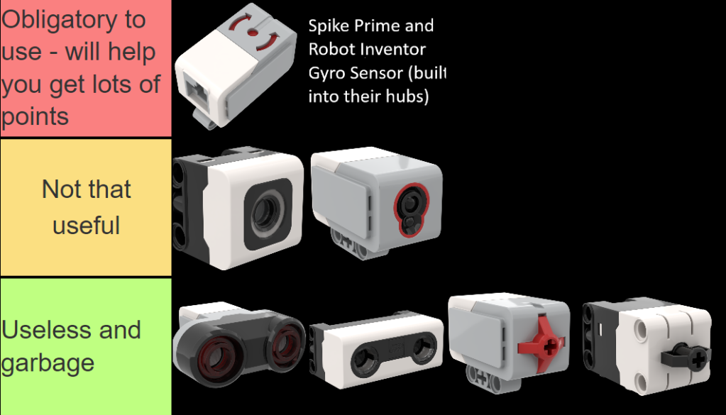 In conclusion, the gyro sensor is by far the most useful sensor, and I highly recommend using it in the ways described above. The colour sensor is less useful this season than previous seasons, and you won’t miss out on very much if you don’t use the force and ultrasonic sensors. You could say that using them is a ‘senseless’ idea hehe…